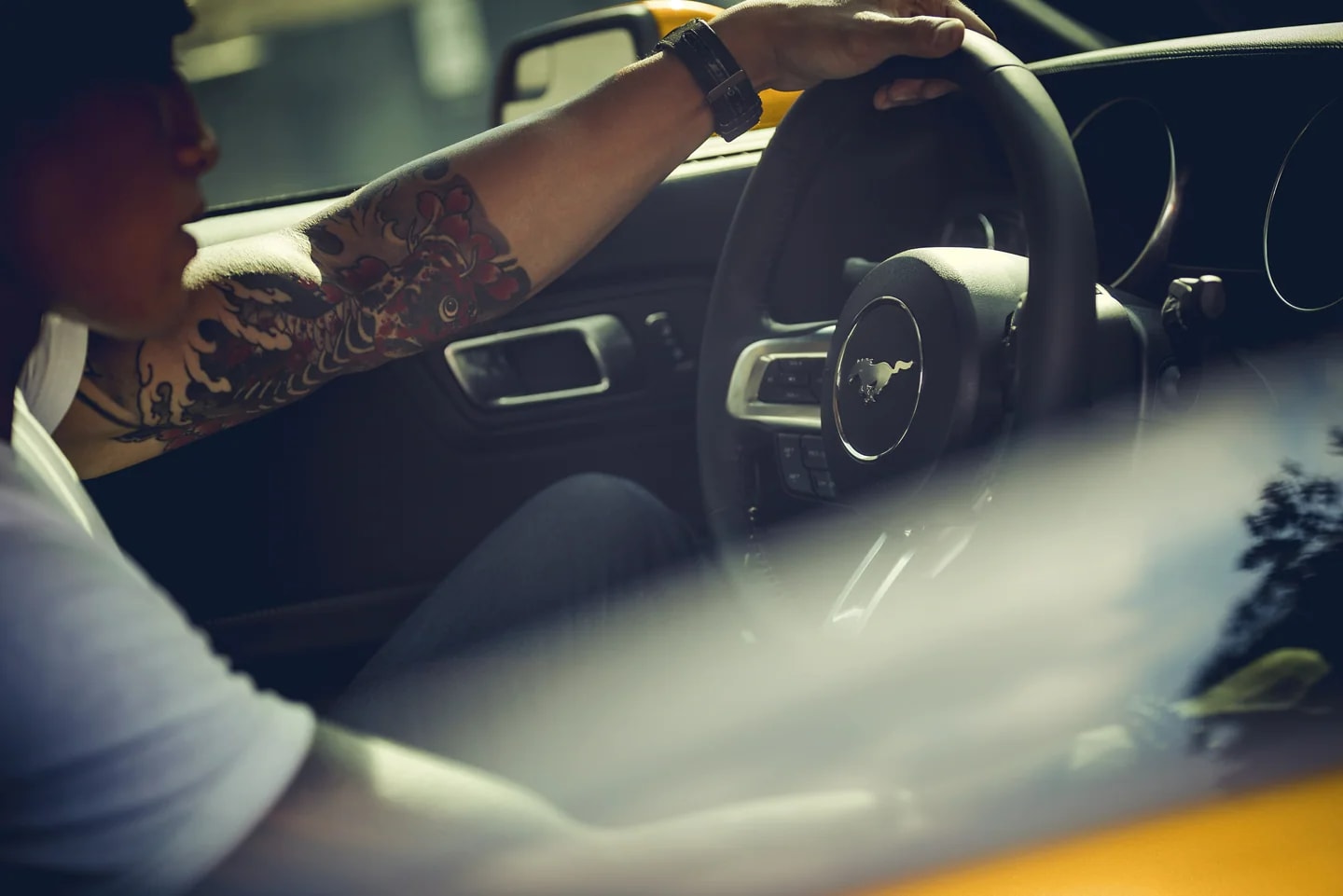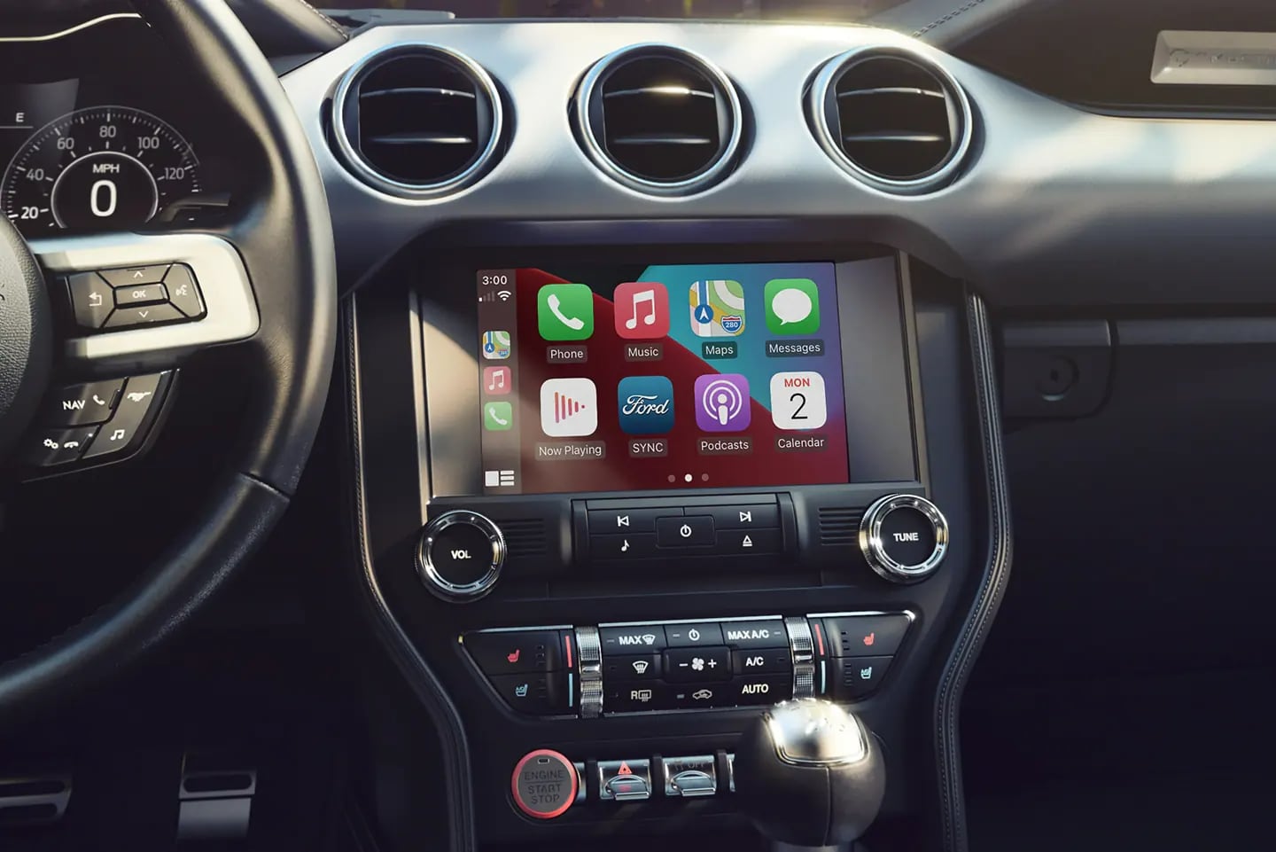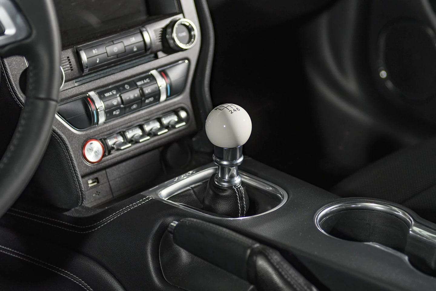 Welcome to the nerve center. Available amenities including heated and cooled seats, an accent-stitched center console and a heated steering wheel make you feel like a part of the machine. And with the push-button start, you truly have the power of a Mustang at your fingertips.